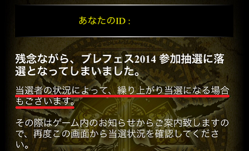 ゲームのホーム画面より、『MENU』→『最新情報・攻略情報』→『ブレフェス2014』→『抽選結果の確認はこちら』の手順で確認することが出来ます。