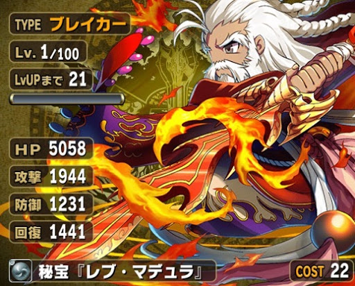 リーダースキルは、★5時代は「炎属性ユニットの攻撃力が50%アップ」だったのが、★6で「炎属性の攻撃力50%アップ、防御&回復力10%アップ」となったため、炎単色パーティだと、ほぼ言うことなしのリーダースキルですね!