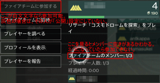 このゲーム、野良で「ファイアチームに入ってもいいですか?」というやりとりは基本的にありません。ファイアチーム設定が「公開」の人は「ファイアチームに入って来てOKですよ」という意思があるものと考え、積極的に参加しましょう。自分でこの設定にしているのですから、むしろ「入って来て!」という意思が強いかと思う。特にファイアチーム設定を「公開」でストーリーミッションをプレイしていて、チーム人数が1/3とか2/3のプレイヤーは参加を待っている人だと思われます。「ファイアチームに参加する」の文字が白くなっている人でレベル差が極端に無ければ迷わず参加で良いと思います。