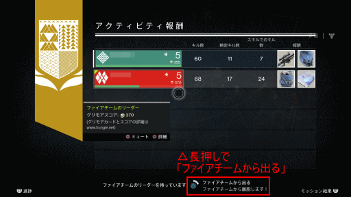 メンバーなら、ミッションクリア後に△ボタン長押しで抜ける事ができます。画面下に△ボタンのマークが表示されています。リーダーをターゲット(R3)してインタラクト(OPTION)からもファイアチームに関するメニューを出せるので、そこからも抜ける事が可能。もしくは、OPTION→リストからリーダーを選択すれば同様のメニューを出せる。
