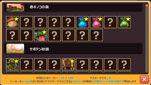- ⑭ヒーロー:現在所有しているヒーローを確認する他に、強化や装備もここで行います