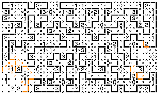 1の角に侵入したらその対角が×になる。それにより確定する線。