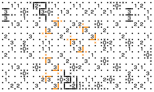 3と2が斜めに向かい合い、かつ3に隣接しない2の辺に1つの×が付いている場合、もう1方の隣接しない辺に線が確定し、かつ残りの2辺どちらかが3に向かって侵入するため、その3の対角は角になる。それにより確定する線(閉じないように)。
