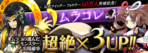 公式ツイッターのフォロワーが600,000人突破記念でムラコレ開催。パズドラ公式広報ムラコがセレクトしたモンスター15種類の的中確率が超絶×3UP!!