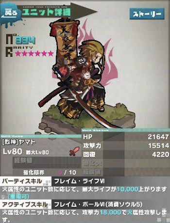 レベルアップ合成で使うと、50,000EXP。売却すれば、50,000ゴールド。進化Ptを250Ptも持っている、かなり有用な素材ユニット。「ロード・トゥ・ワールド」の裏ルートにたどりつけた時のみ入手可能。