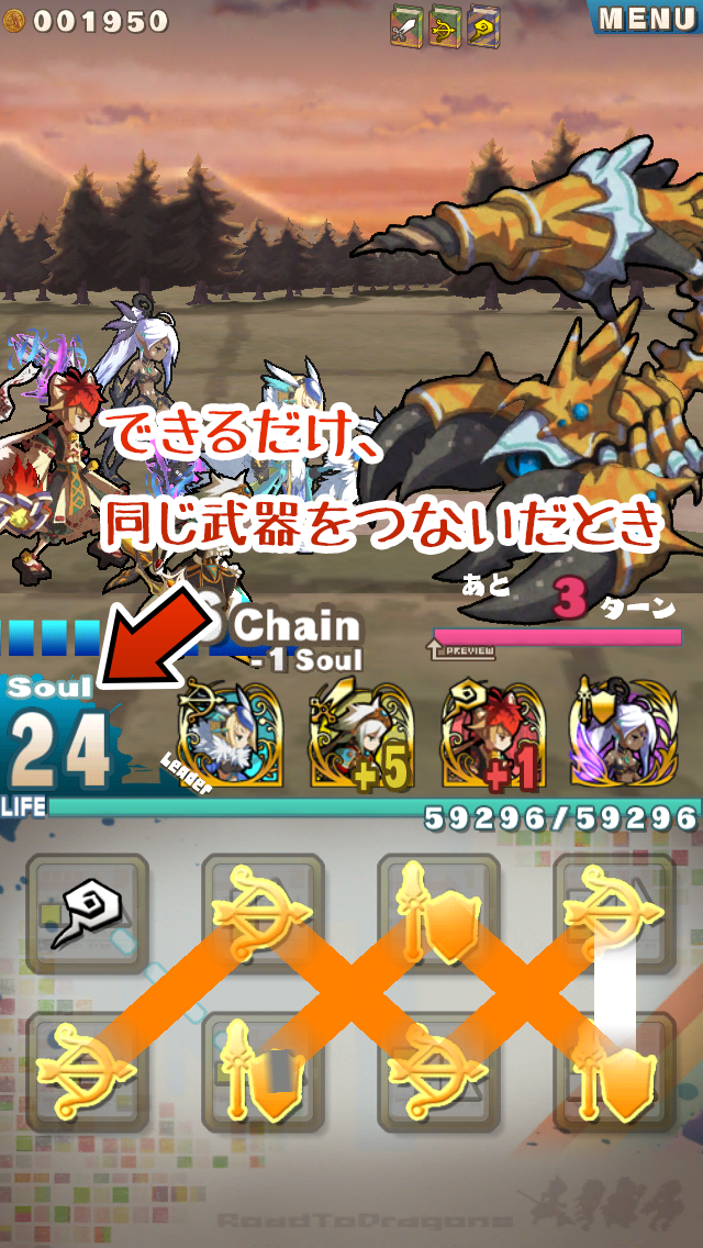 攻撃パネルは、複数の武器をつなげる事もできますが、武器をまたぐときにソウルが1消費されます。なので、できるだけ同じ武器をつなぐようにしましょう!