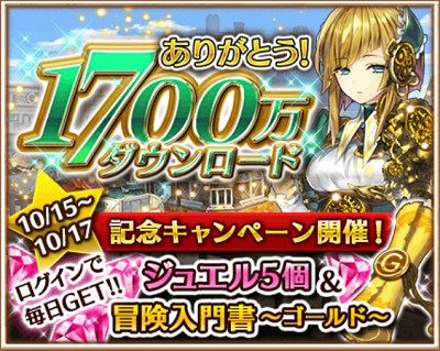 1700万DL突破を記念して、またまたジュエルや冒険入門書がもらえるようなので、こちらでキャンペーンの概要をチェックしていってね♪