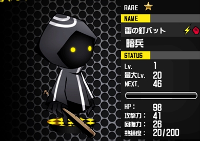 このページは暗兵(雷の釘バット)【☆1】のステータスやスキル、進化ルート等を掲載しています。