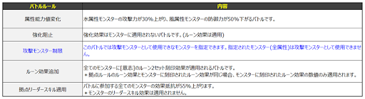 :【攻撃モンスター制限】が適用された拠点では、攻撃時に使用するモンスターを制限できます。ギルドが特殊ルールを設定する時に制限モンスターを指定できます。指定されたモンスター(全属性)は攻撃モンスターとして使用できません。(防衛デッキには使用可能)