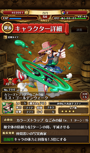 進化させてもステータスは弱めですが、必殺技の効果が「敵全体の防御力を2ターンの間、半減させる」なので、硬いボスキャラとかに使えそうです!是非、☆4に進化させて使いましょう!