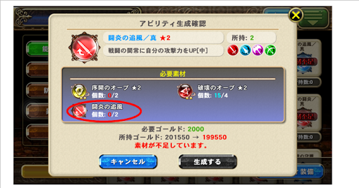 この画面赤丸にあるように「闘炎の追風」は3段階の強さに分かれています。単純に考えてたら「闘炎の追風/絶」が一番強いので「弱いの作るより、さっさと強いの作ろう!」と思っても、いきなり一番強いアビリティを作ることは出来ません。