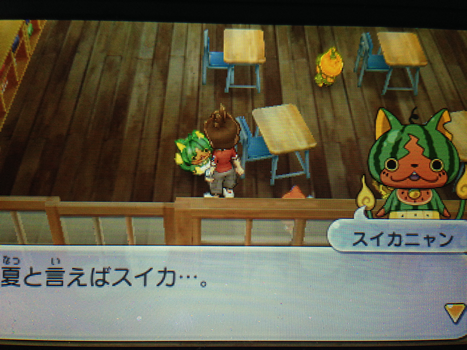 メロンニャンは現代のケマモト分校の左側にある教室にいます。好物はチョコボーで、駄菓子屋で購入することができます。